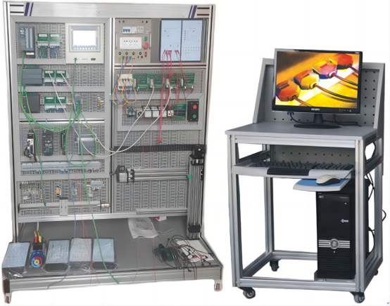 采用模块组合式结构,含开关量、模拟量、变频调速、触摸屏、通信模块等,配套MCGS工控组态监控软件,实现仿真化、信息化实训教学。