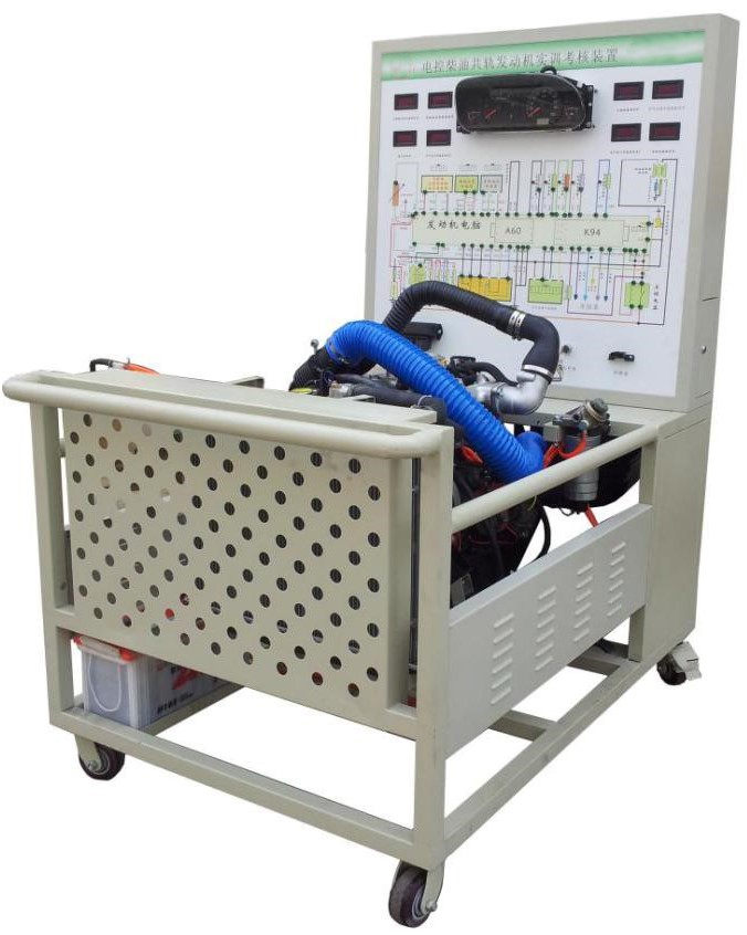 新柴电控共轨柴油发动机总成、原车发动机控制电脑、组合仪表、防盗电脑、发动机起动运行所有相关的原车附件、故障设置和排除系统、原车电路原理图板及检测端子、60AH大容量蓄电池、大容量不锈钢油箱、发动机加速机构、控制面板柜、可移动台架、台架电源总开关、OBD诊断座、散热系统、任务驱动教学模式的实训指导书及台架操作说明书。