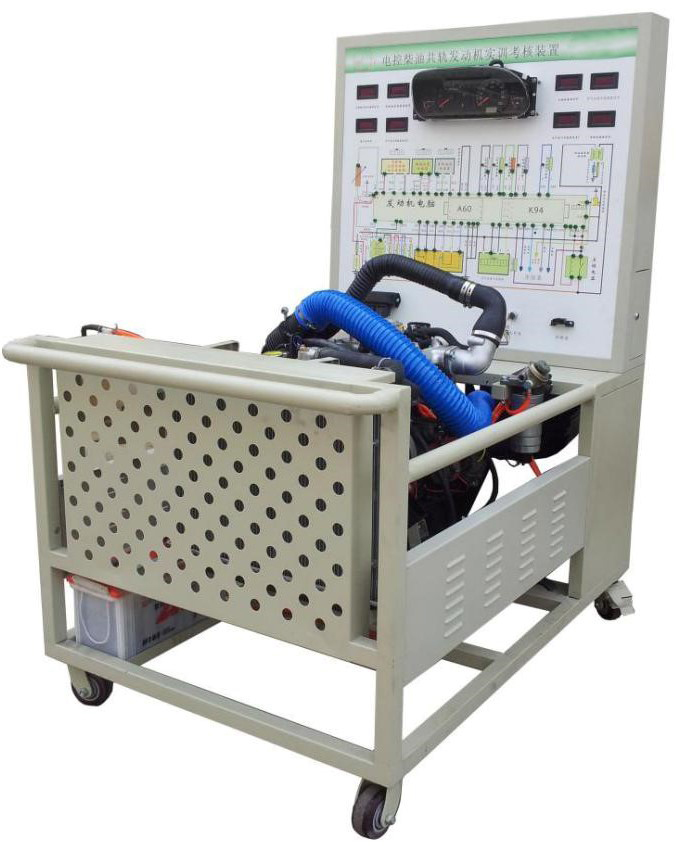 长城电控共轨柴油发动机总成、原车发动机控制电脑、组合仪表、防盗电脑、发动机起动运行所有相关的原车附件、故障设置和排除系统、原车电路原理图板及检测端子、60AH大容量蓄电池、大容量不锈钢油箱、发动机加速机构、控制面板柜、可移动台架、台架电源总开关、OBD诊断座、散热系统、任务驱动教学模式的实训指导书及台架操作说明书。