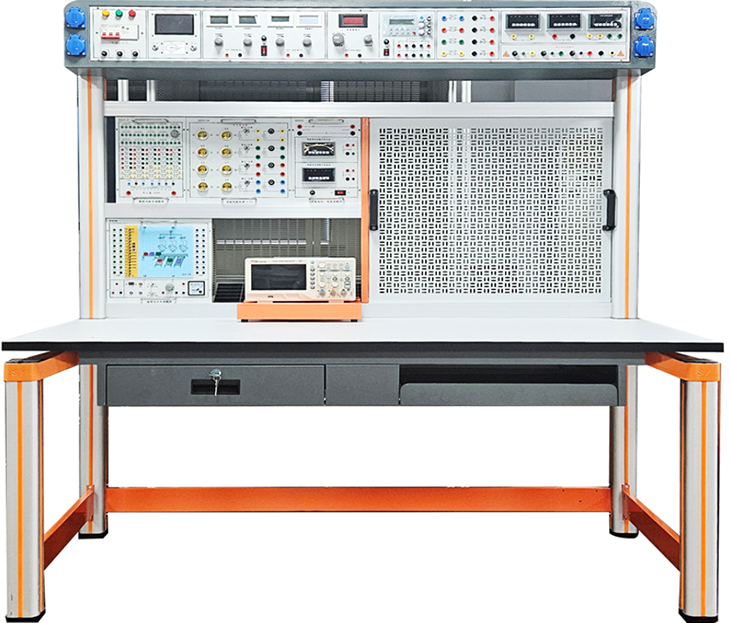 实验桌后面二支桌脚向上延伸,配上特制拉模成型的带滑槽横梁铝型材组成实训屏,实训时左边放置电气实训挂箱(2层)及示波器支架,右边装置网孔板等,实训挂箱、网孔板在实训屏上实训时上下方便,左右移位自如。实训屏顶部安装主机箱,实训屏底部安装实验仪器工作电源箱。