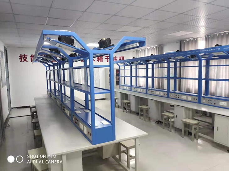 实训台上提供日光灯(用于照明)2个,透明的PVC板4个,可夹放原理图等资料,另外还配备三芯双联暗插座4个、两芯暗插座2个、工具柜2个,工作台面设有绿色防静电桌垫,整个装配线安全可靠。