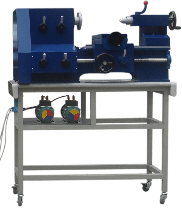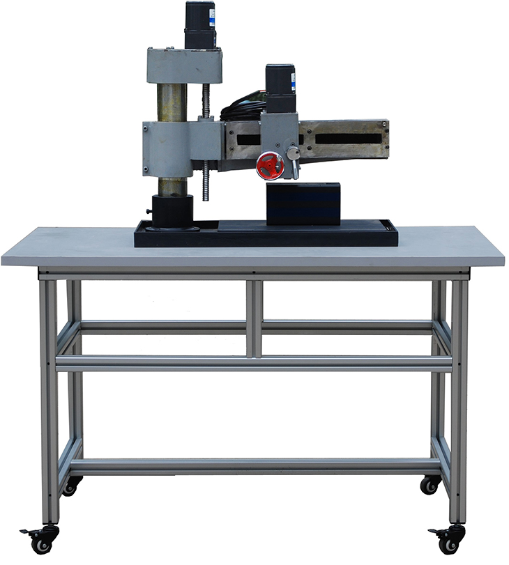 智能型四合一机床半实物仿真模型放置在工作桌上。智能型四合一机床半实物仿真模型是参照智能型四合一机床的尺寸按照一定比例缩小设计;半实物机床上所有电气元件电压等级与实际的机床完全相同;半实物机床的床身采用铸件;滚轴丝杠传动;手轮使用实际机床部件,贴近真实机床;机床活动导轨表面采用高频淬火工艺,经久耐用。