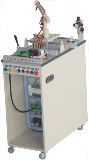 由机械手、横臂、回转台、旋转气缸、开关电源、可编程序控制器、按钮、I/O接口板、通讯接口板、电气网孔板、多种类型电磁阀及气缸组成,主要完成将工件从上站搬至下一站。