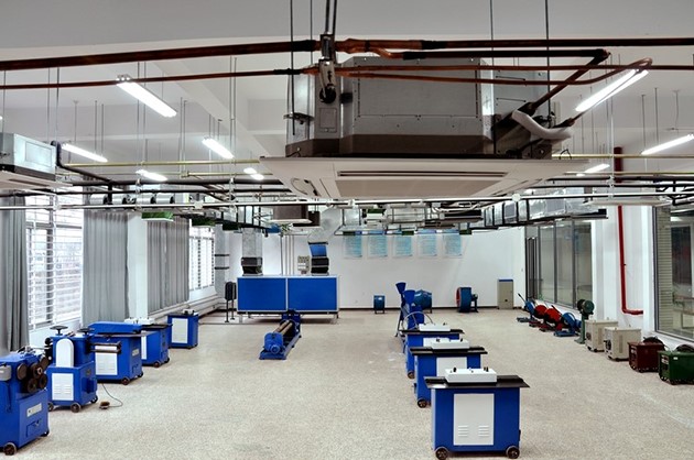 3.组合式空调机组、新风机组、风机盘管、冷却塔、风机、消声器、多联机、滚剪机、咬口机、卷圆机、合缝机等主要设备,组成一次回风式空调系统、新风加风机盘管空调系统、排风系统、多联机空调系统等四个系统,可以承担组合式空调机组安装、冷却塔安装、新风机组安装、风机盘管安装、风机安装、多联机安装、风口安装、风管制作等8个实训项目。