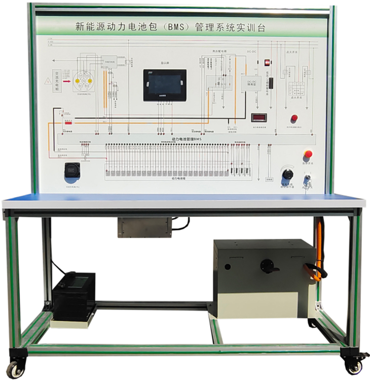 磷酸铁锂动力电池包与铁制电池箱(单体电池3.2V 20AH24串)、BMS锂电管理一体机、动力电池包触摸显示屏、车载充电机、国标充电插口、国标充电枪、紧急断电开关、霍尔电流传感器、直流接触器(包含充电继电器、总正继电器、总负继电器、预充继电器)、DC-DC转换器(72V-12V30A)、辅助蓄电池(12V45AH)、放电控制继电器与放电负载电阻、预充电阻器、可移动实训台(1500×700×1700mm 带自锁脚轮装置,带安装检测端子的原理面板,面板1448×940mm)、故障模拟与排除装置、设备操作说明书。
