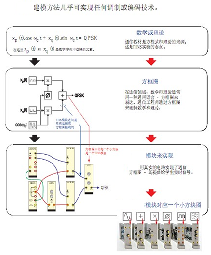 通信系统原理实验室主要设备采用设计型开放式设计理念,跟以往验证型实验设备有本质区别。整个系统采用基于方框图的模块化设计,以数学函数方框图形式来确定硬件基本模块,灵活组合模块以实现任何调制或编码技术。