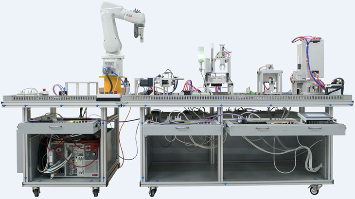 工业机器人循环生产线实训装备采用1+1组合式结构分别由安装在铝合金导轨式的实训台上的送料单元、加工单元、装配单元、双层输送单元、分拣单元5个单元,加上由铝合金导轨式的实训台上工业机器人码垛单元两大部分组合成多种组合方式的实训装备。电气布局采用抽屉式,所有其电气控制器都安装在网孔板式的抽屉上,这种机电分离的格式更加符合了工业实际情况。外观如上图所示。