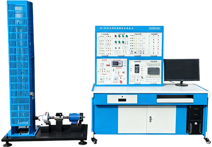 机电传动控制综合实验台机电传动控制综合实验台,主要用于机电类专业的教学与实验。由左侧的机械传动装置(包含立柱、链条、联轴器、电机等)和右侧的控制实验台(集成了控制面板、仪表、PLC、计算机等)组成。