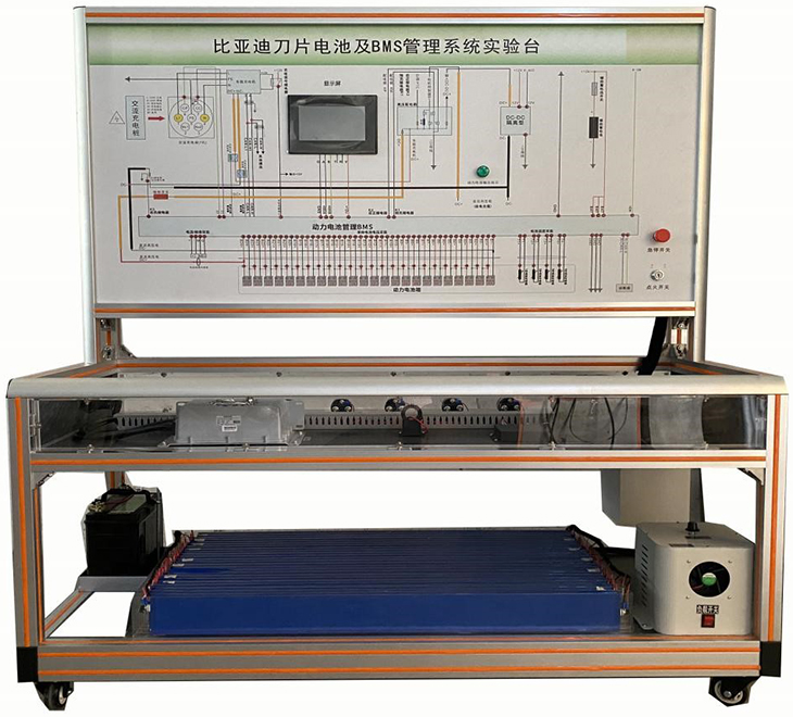 刀片电池及BMS管理系统实验台选用比亚迪 新能源车辆 刀片电池 动力电池包,单体电池(比亚迪BYD3.2V135Ah刀片电池,共16串),带CAN总线的BMS电池管理系统,有被动均衡功能;真实地呈现了磷酸铁锂动力电池包核心零部件之间的连接控制关系、安装位置和运行参数,以及高压系统安全注意事项,并培养学员对磷酸铁锂动力电池包(BMS)故障分析和处理能力。适用于了解与验证电动汽车的动力电池参数进行实时监控、故障诊断、SOC估算、短路保护、绝缘检测、充放电控制、均衡等功能,并通过CAN总线的方式与带CAN通讯的车载充电机进行信息交互,保障电动汽车高效、可靠、安全运行的BMS教学实训实验。