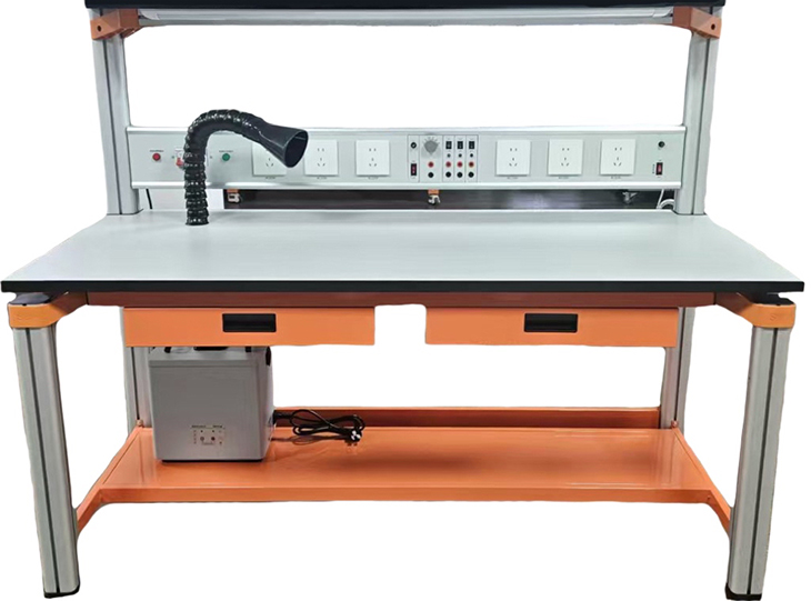 电子基本技能实训考核装置由仪器架、电源控制箱、实验桌、焊锡烟雾净化机、学生凳等组成。实验装置支架与实验桌可组合、可拆装。支架与桌脚一体,铝合金结构。