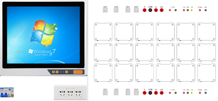 主机箱面板布局设有电源安全控制、示波器、函数信号发生器等接口。嵌入式虚拟仪器及电源包含:双通道1280MSPS实时采样模拟输入通道,输入范围±25V,可通过x10探头扩展到±250V,带宽50MHz;可配置为双通道80MSPS示波器;