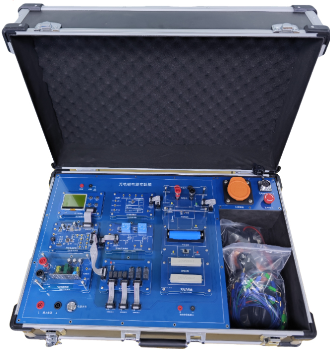 充电桩电路实验箱由铝木合金箱体、实验电路区组成。其中实验电路区采用全开放模式,可方便连接、测试各实验电路,以满足不同层次学生的教学实验要求。