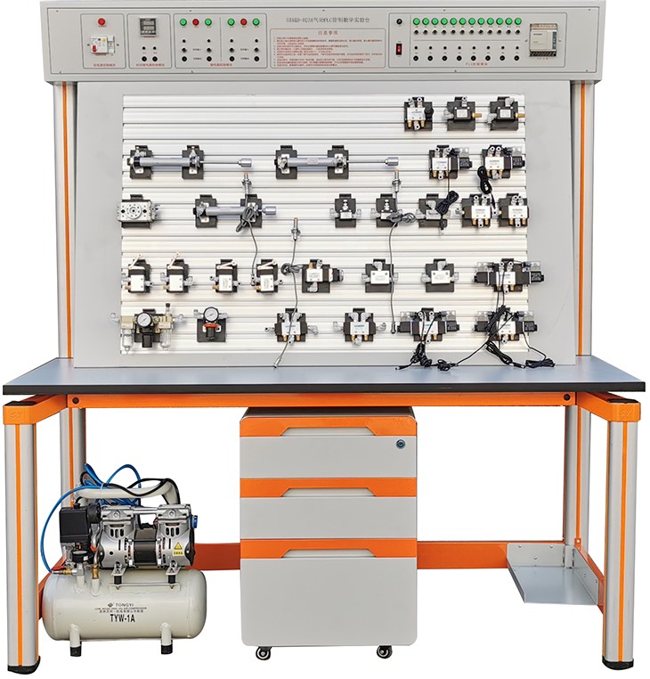 实验桌后面二支桌脚向上延伸,配上侧面三角形斜面钣金框架及带T槽铝合金操作面板组成实训操作屏,实训时固定气动控制模块等,实验台架顶部安装实验主机箱,主机箱提供实验时的时间继电器、可编程控制器、控制按钮、接近开关、直流电源等。