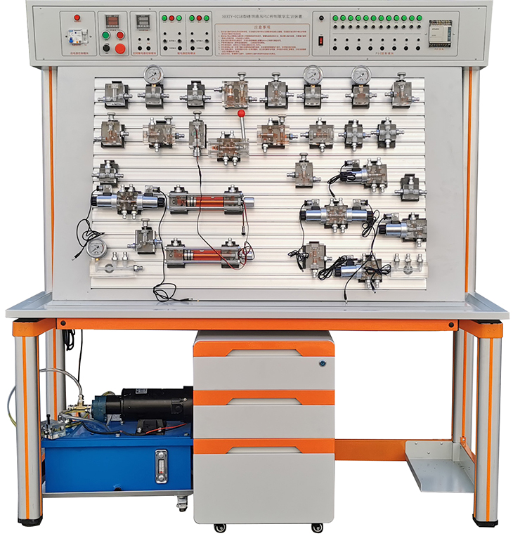 泵可选择齿轮泵、摆线泵、叶片泵等任一种。电机:直流电机,从零开始无级调速。功率350W,直流调速器调速。内置于实验台内,离液压台1.5m远处噪声≤48dB.