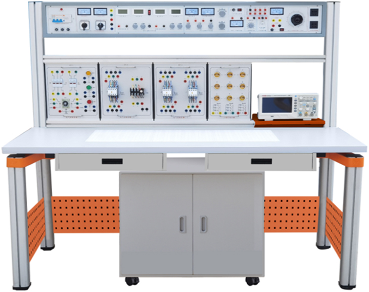装置由主机箱、实验桌、实训屏、实训挂箱、移动矮柜、示波器架、学生凳等组成。实训装置支架与实训桌可组合、可拆装。支架与桌脚一体,铝合金结构,实训挂箱、各实验模块可根据实验需求自由组合放置。