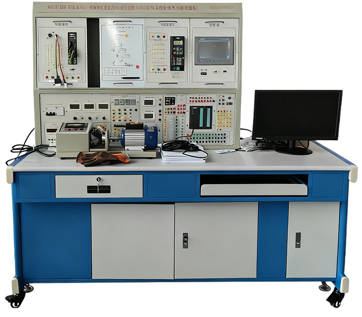 实训装置由控制屏、实训桌、主机实训组件、实训模块(含丰富的工业现场设备模拟实训对象)、变频器挂箱、触摸屏挂箱、交直流电机、总线单元、等组成。