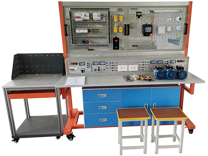 本实训台由实训屏(内置电源)、实训桌、实训储物柜三大部分组成。