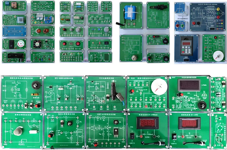 汽车电工电子基础实训模块由透明封闭元件盒及PCB板构成。元件盒体由透明有机工程塑料注塑而成,具有示教功能,使用者能够观察到元件形状和接线方式,有利于教师讲解和学生认识;面板采用PCB制作而成,表面清爽、符号线路清晰、元件更换容易。元件盒面板尺寸58mm*58mm,尺寸58mm*124mm,124mm*146mm三种规格。