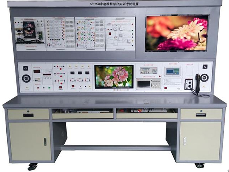 家电维修综合实验台,是根据中华人民共和国劳动和社会保障部发布的《家用电子产品维修工职业技能实训和鉴定设备技术规范》,按照职业教育的教学和实训要求而研发的产品,适合高职院校、职业学校的应用电子技术、电子电器应用与维修等专业的电视机原理与维修、家用电子产品原理与维修等课程的实训教学。