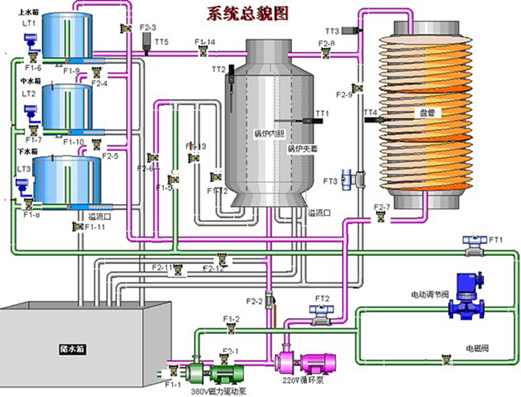 实验对象系统包含有:不锈钢储水箱;上、中、下三个串接有机玻璃圆筒型水箱;三相4.5kW电加热锅炉(由不锈钢锅炉内胆加温筒和封闭式外循环不锈钢冷却锅炉夹套构成)和铝塑盘管组成。