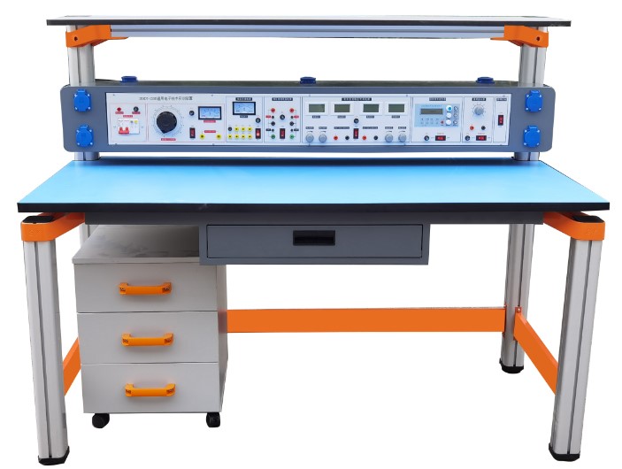 电子技术实训台具有较完善的安全保护措施,较齐全的功能(详见实训台结构简介)。实训桌中央配有通用九孔万能插件板,九孔万能插件板主体由ABS注塑而成,表面布有九孔成一组相互联通的插孔,九孔万能插件板内部内嵌126组铜质九孔一体成型嵌件。实训中的弱电模块必须以独立封装的透明元件盒为单一模块,元件盒统一都能配合九孔万能插件板像搭积木一样的形式自由搭建组合电路,元件盒盒体透明,内装元件直观性好,盒盖印刷电路图防刮耐磨,符号美观清晰。元件盒盒体与盒盖采用较科学的压卡式结构,维修拆装方便。元器件放置在实训桌下边储存柜内,大大提高了管理水平,规划化程度,大大减轻了教师实训准备工作。