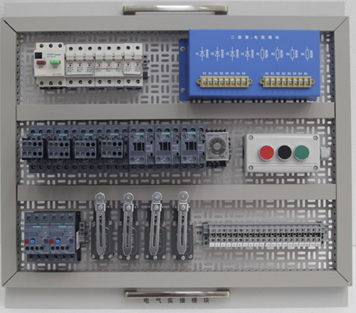 1)采用厚网孔板,工业灰喷塑,面板安装一线品牌的电器元件(空气开关、熔断器、交流接触器、时间继电器、热继电器、按钮、指示灯、接线端子等)。实操模块具有快速拆装等优点,与实训台桌面具有一定角度安装,符合人体视觉。可以满足电工(中级、高级)、机电考核、技能鉴定等功能。