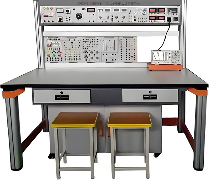 实训桌为铁质双层亚光密纹喷塑,桌面为防火、防水、耐磨高密度板,结构坚固,造型美观大方。实训桌下方设有元件储存柜,可以放置实训挂箱,还设有四个带刹车的轮子,便于移动和固定。