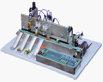 材料分拣实验模型,材料分拣实验装置采用台式结构,配有PLC(自备)、传感器(金属物料检测、非金属物料检测、磁性物料检测)、直流电机、输送带、电磁阀,减压阀,空气滤清器,气压指示表、金属物料、非金属物料、磁性物料等。是一套模拟工业自动化生产物料分拣过程的微缩模型,可以实现不同材料的自动分选和归类,并由上位计算机监控。