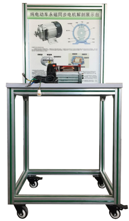 低压永磁同步电动机解剖展示台选用新能源电动车电机(60V2KW永磁同步电机),通过解剖,剖面喷涂不同颜色,总成内部的机械结构和相互之间的装配关系清楚的显现在外面。展示驱动电机内部结构,可对照解剖物,了解驱动电机结构与原理。