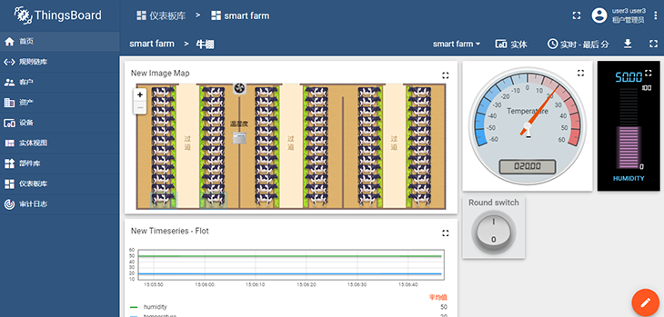 图:智慧牧场课程案例,在牛棚内安装温湿度传感器和排风扇,在ThingsBoard云平台上制定规则策略,当棚内温度过高时自动开启排风扇对牛棚进行降温,以保障奶牛养殖环境处在适宜的温度下。