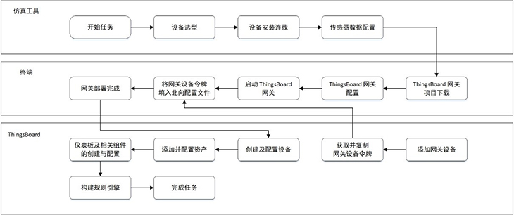 模拟智慧牧场系统还引入使用开源软件平台ChirpStack与ThingsBoard,结合LPWAN技术,实现远程低功耗数据采集、上报和展示。在ChirpStack平台上,用户可对网关、GPS、温湿度传感器等设备进行配置,以上送仿真实验中的虚拟数据。在ThingsBoard平台上,设置牧场地图、告警信息、温湿度等各仪表盘组件;获取仿真设备上送的数据,并将数据以图表形式作可视化呈现;以及基于流式编程添加相应的规则策略,最终完成模拟智慧牧场实训场景的部署搭建。