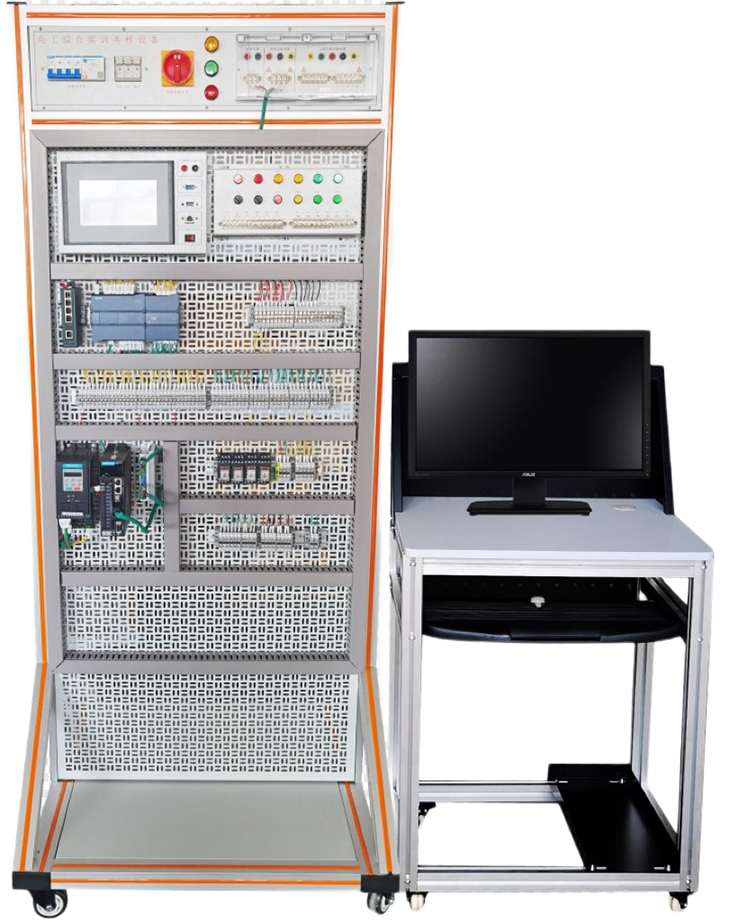 实训屏底盘钢铝结构,实训时放置电机,框架是工业铝型材结构,万能网孔板镶嵌铝型材中间,配以桔黄色装饰条,豪华大气,采用开放式设计,操作空间大,实训操作方便,装有4只万向轮,便于移动。采用双面结构,正面电机控制实训,背面照明电路实训。