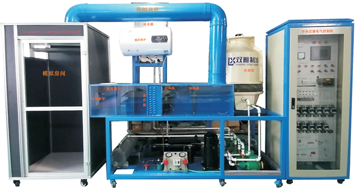 由一个模拟房间,和一个组合式风柜组成。模拟房间采用30*30工业标准铝型材和双面烤漆木板结构,内部装有和真实空调末端同样的风机盘管,三级调速,由调整开关用户自由调。组合式风柜系统由回风口,新空气混合风口,送风机,中央空调蒸发器,管道,电磁阀组成。